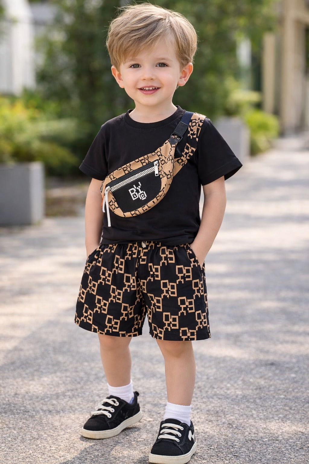 0000 Black Side bag Printed Half Sleeves T-shirt with Printed Shorts Kids Suits