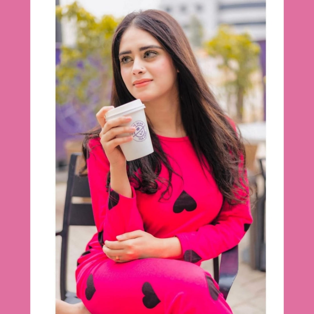 Shocking Pink With Black Big Heart print Full Sleeves Night Suit for her