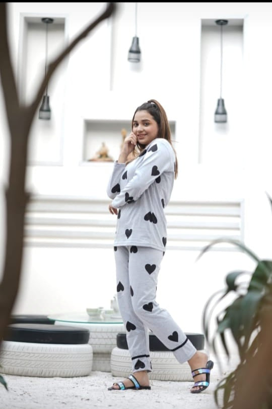 012 Grey and Black Hearts Print Full Sleeves Night Suit for her