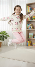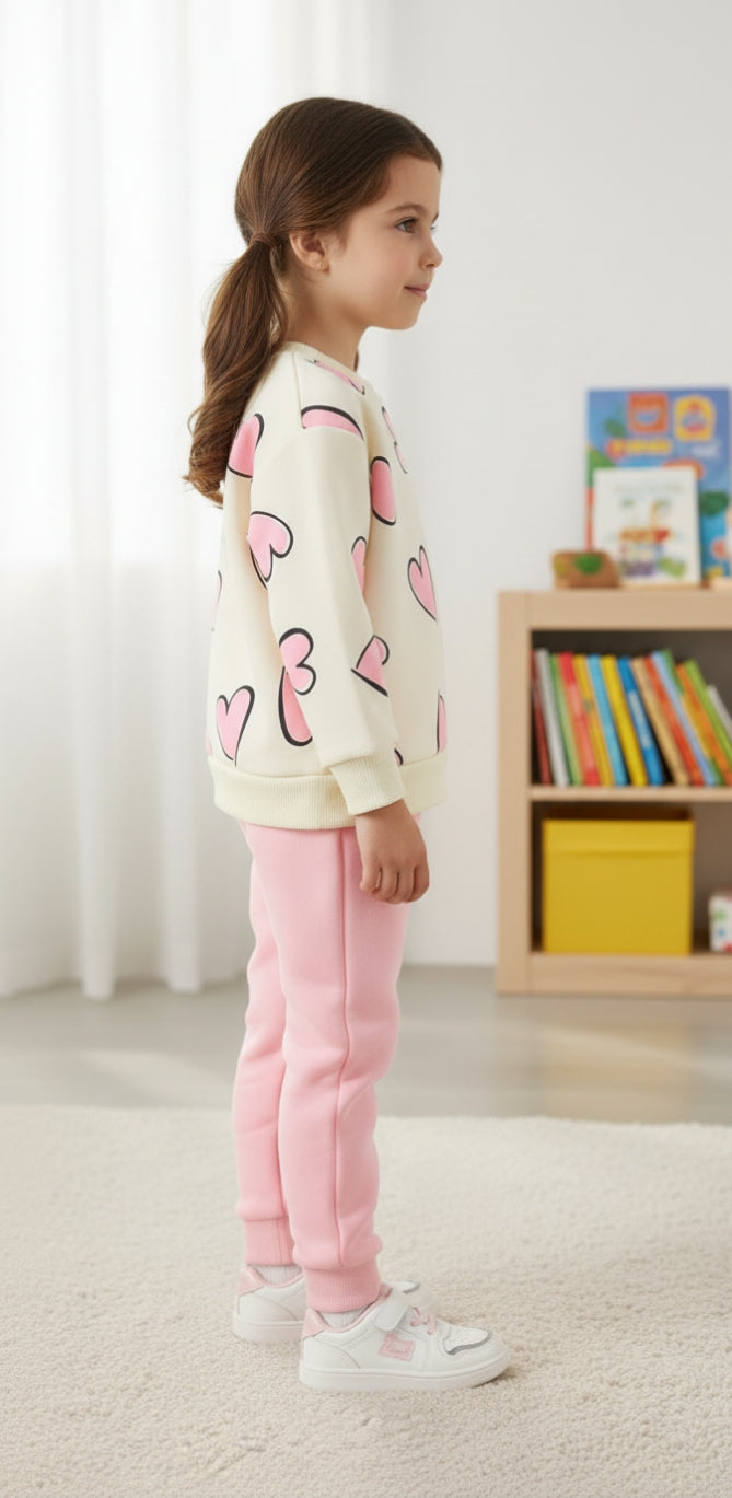 0000 Offwhite Pink Heart Printed Sweatshirt With Plain Fleece Trouser Tracksuit For Kids