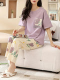 0001 Lilac Floral Pocket Printed Half Sleeves T-shirt With Floral Printed Pajama Suit